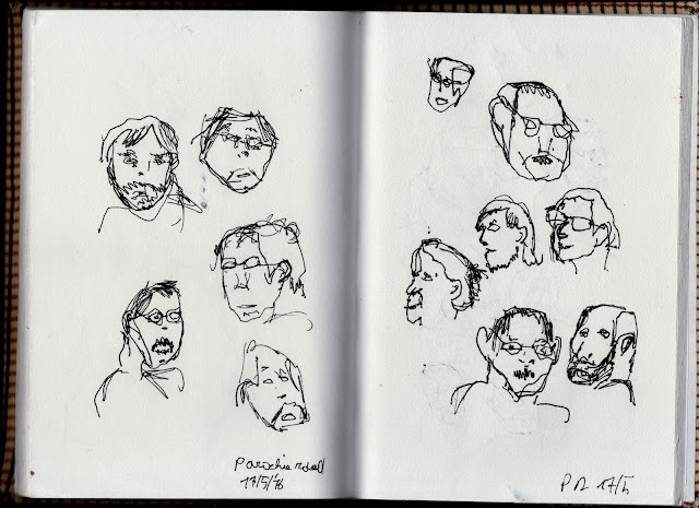 This Tuesday I was in a boring meeting where I hadn't too much to do so I spent the time sketching the people around the table. I'm getting better with faces. Now for the bodies...